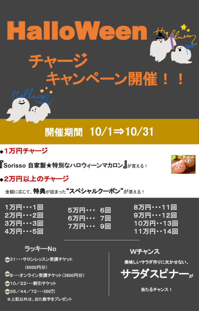 『Sorisso☆ハロウィンチャージキャンペーン』いつも受付でのチャージが、めっちゃお得に!!!