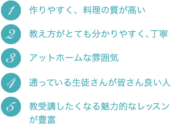 - 単発でレッスンに参加できる事と、料理本やTVの料理番組で知れない下ごしらの方法や調理のポイントなどを教えてもらえるのが良いなと思います。